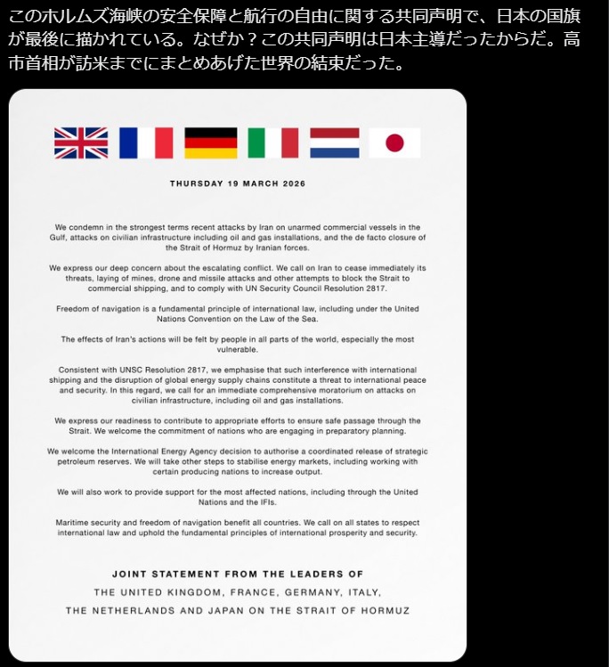 フランスのマクロン大統領は17日、中東で戦闘が続いている間は、フランスがホルムズ海峡の安全確保のための作戦に介入することはないと述べ、トランプ大統領の要請を拒否しました。ホルムズ海峡をめぐっては、トランプ大統領が日本などの国に、艦船の派遣を求めています。マクロン大統領は17日、「フランスが石油の供給再開や解放を目的とした通常の作戦に参加することは決してない」と述べ、派遣を拒否しました。さらに「フランスはこの戦争を選んだわけではない。我々は参戦しておらず、自国民の保護と同盟国への支援という、純粋に防衛的な立場をとっている」と述べ中東での戦闘に関与しない旨を強調しました。https://news.yahoo.co.jp/articles/44f47a29e67102614d9107fcce8fc5693b424ac0