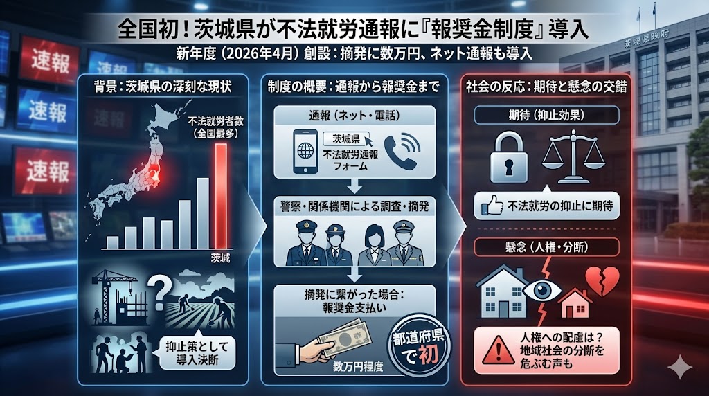 茨城県は、外国人の不法就労についての情報を募り、県警による摘発につながった場合に報奨金を支払う「通報報奨金制度」を新年度から始める。出入国在留管理庁(入管庁)にも同様の通報制度があるが、県によると都道府県レベルではあまり例がないといい、識者からは「差別を助長する恐れがある」との指摘も出ている。入管庁によると、2024年に不法就労と認定された外国人1万4千人あまりのうち、茨城県で働いていたのは3452人で、都道府県別では3年連続で最多だった。報奨金制度は、寄せられた情報をもとに担当者が調査し、不法就労が疑われる場合には県警に連絡する流れ。報奨金は数万円程度を想定しているという。https://www.asahi.com/articles/ASV2M343WV2MUTIL00PM.html