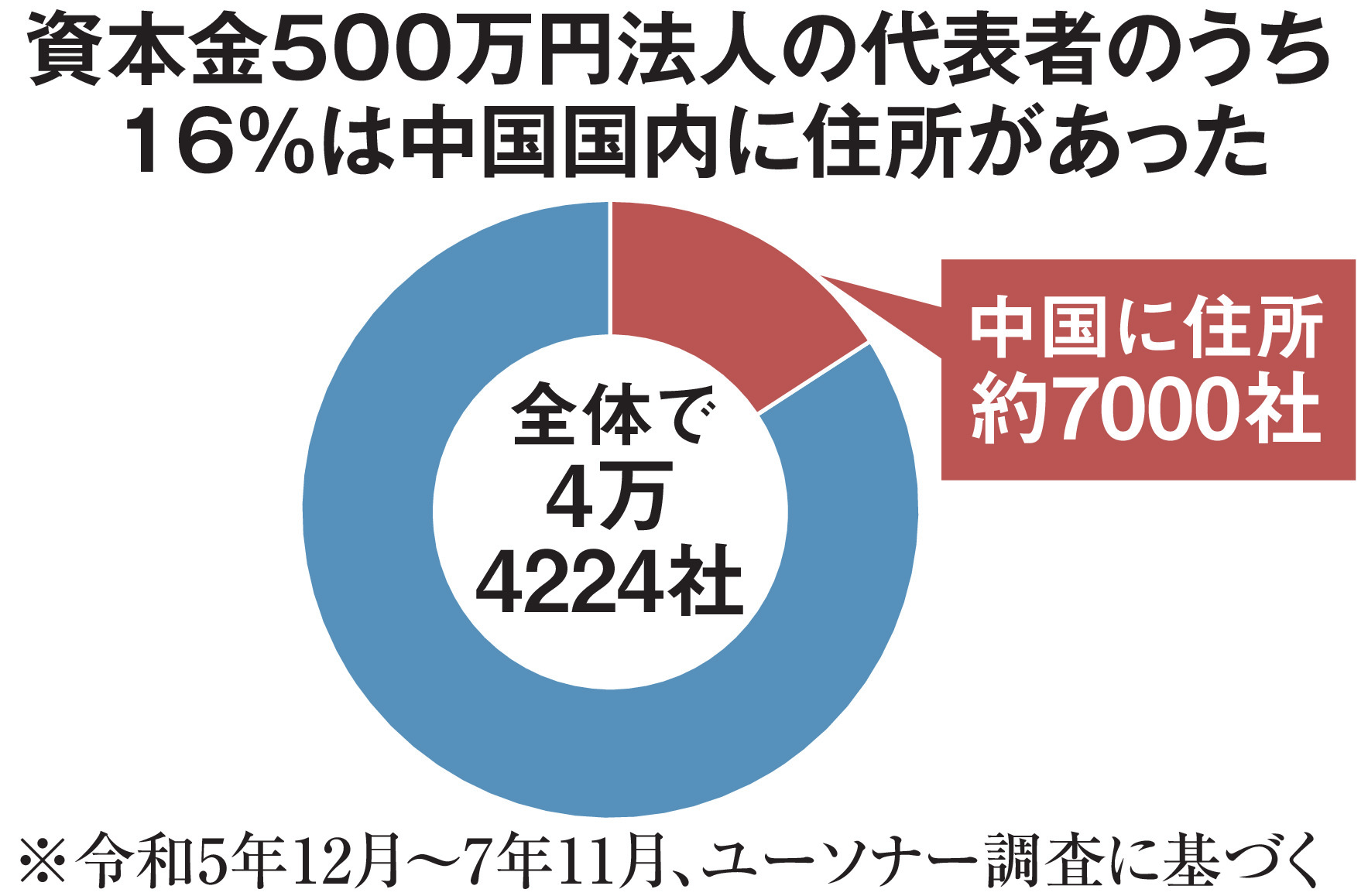 全国で令和7年11月までの2年間に設立された資本金500万円の法人4万4千社余りのうち約7千社の代表者の住所が中国国内だったことが31日、調査した民間会社への取材で分かった。日本で起業する外国人向けの在留資格「経営・管理」は資本金500万円以上の法人を設立すれば取得できたが7年10月に資本金の下限が引き上げられるなど厳格化。ただ、多数の中国人が資本金要件の甘いうちに自国在住のまま起業し、在留資格を得た疑いがある。https://news.yahoo.co.jp/articles/2a7e56abc5d129e4e59df0d7f5f20f8011dce708