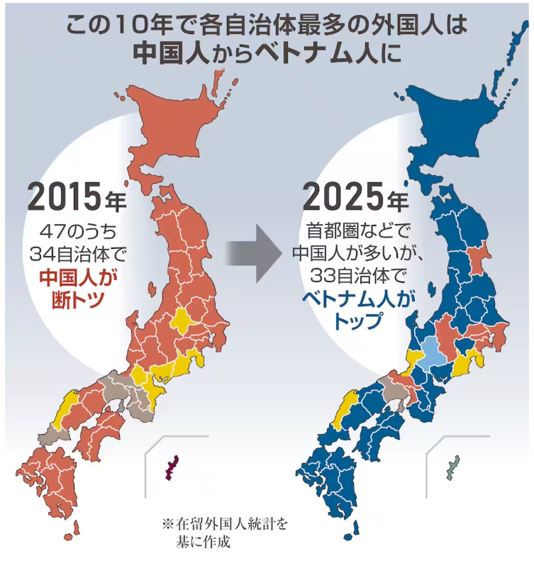 国内に在留する外国人について、出入国在留管理庁の「在留外国人統計」を基に都道府県別の在留数を調べたところ33道県でベトナム人がトップを占めていることが2日、産経新聞のデータ分析から分かった。10年前は中国人が34都道県で最多だったが、状況が大きく変化した。人数で最も多いのは中国人だが、首都圏や大阪府など大都市圏に集中、一方でベトナム人が地方経済を支えている実態が浮かんだ。令和7年6月末時点の在留外国人は過去最多の395万6619人。国籍別の上位は中国90万738人、ベトナム66万483人、韓国40万9584人の順だった。構成比は中国22.8%、ベトナム16.7%、韓国10.4%で、この3カ国で全体の約半数を占めた。https://www.sankei.com/article/20260102-FEWPTCXAM5I6ND55NSTHZK2Y3U/