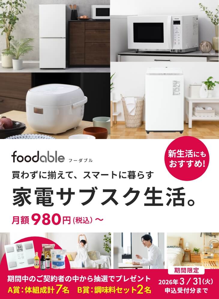 パナソニックは21日、新生活を始めるのに必要な家電4種類を貸し出すサブスクリプション(定額課金)サービスを始めたと発表した。炊飯器、電子レンジ、冷蔵庫、洗濯機を月額4980円で貸し出す。春の引っ越しシーズンを前に10~20代など単身世帯の需要を見込む。調理家電と食材をセットにしたサブスクサービス「foodable(フーダブル)」の単身世帯向けコースをリニューアルした。従来の単身者コースにあったオーブントースターの代わりに洗濯機を採用した。利用者から「洗濯機もあれば新生活に必要な家電が一通りそろう」との声が上がっていたことに対応した。炊飯器またはレンジのみで月額980円、冷蔵庫を加えた2種類で月額2980円の、価格を抑えたコースも用意する。https://www.nikkei.com/article/DGXZQOUF217XU0R20C26A1000000/