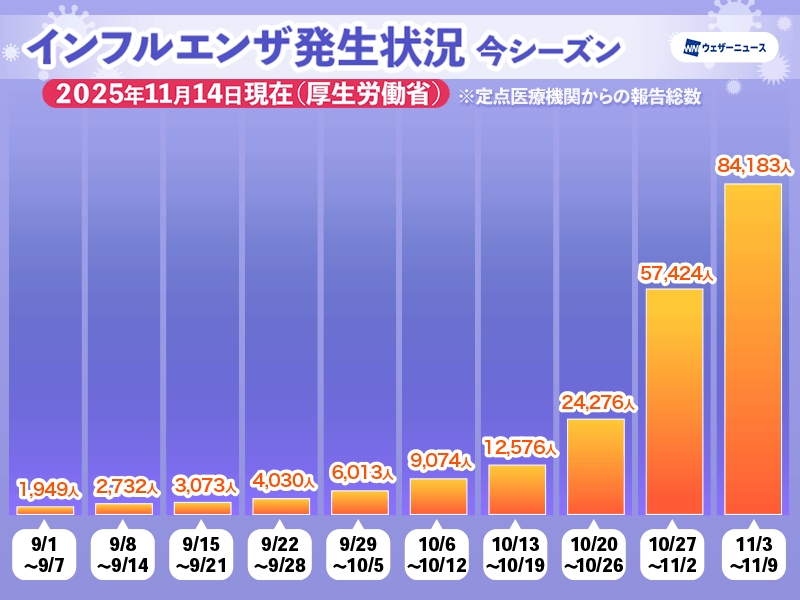 11月14日(金)、厚生労働省は2025年11月3日〜11月9日のインフルエンザ発生状況を発表しました。この1週間における定点医療機関からの報告数は「84,183 人」で、定点あたりの報告数は20を超えました。今後も増える見通しのため、人混みなどへ出かける際は感染予防を十分にしてお過ごしください。定点当たりの報告数は全国で21.82。昨年同時期は1.06だったので大幅に高いことがわかります。都道府県別で見ると、宮城の47.11が最も高く、次いで埼玉45.78、神奈川36.57、福島34.63、岩手30.24と続き、この5県が30以上の警報レベルの基準値を超えています。https://weathernews.jp/news/202511/140126/