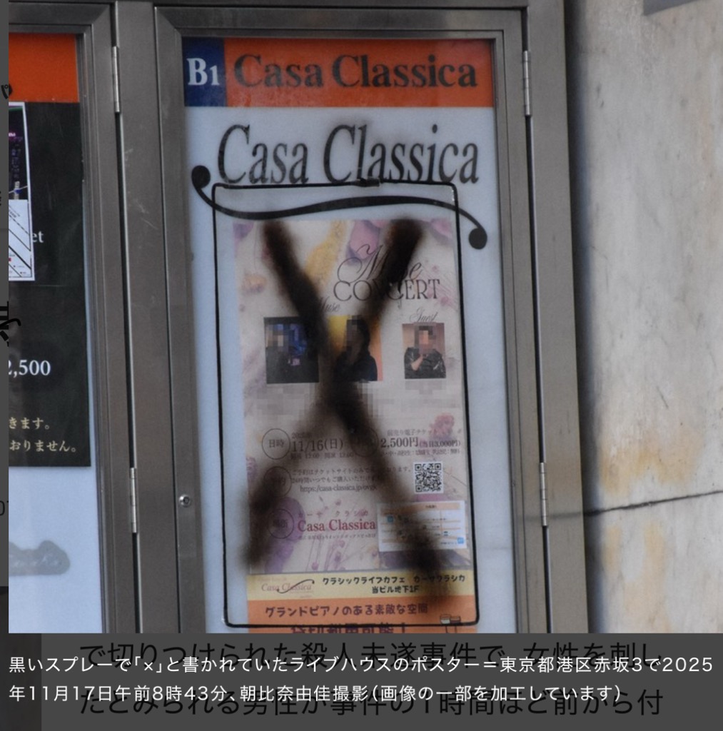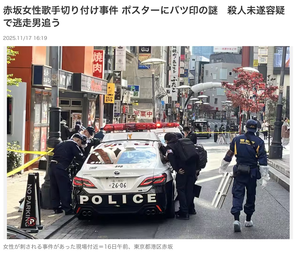 16日午前10時半ごろ、東京都港区赤坂3の商業ビル地下1階で「黒い帽子の男に女性が刺された」と110番があった。歌手の40代女性が左腹を刺されて病院に搬送された。搬送時に意識はあったが重傷とみられる。女性は搬送前に「面識のない男性に刺された」と話したといい、警視庁は殺人未遂事件として逃げた人物の行方を追っている。警視庁赤坂署によると、女性は地下1階にあるライブハウス前で、従業員がこの店を開けに来るのを待っていたところ、突然刺された。襲った男性は黒い帽子と上着を着用していたという。現場から刃物は見つかっておらず、刃物を持ったまま逃げている可能性がある。現場は東京メトロ赤坂見附駅前の繁華街。https://mainichi.jp/articles/20251116/k00/00m/040/165000c