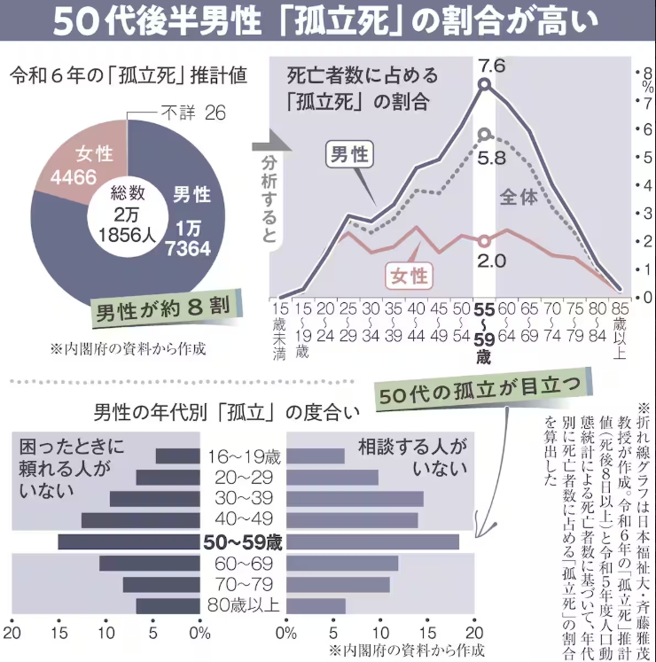 働き盛りの中年男性の間で深まる「孤立」が問題となっている。内閣府が今年4月に初めて公表した「孤立死」の推計をもとに専門家が分析したところ50代後半男性の孤立死の割合が女性や他年代の男性よりも高いことが明らかになった。19日は男性や男児の幸福と健康に目を向け、ジェンダー平等を促す国際男性デー。専門家は、男性が悩みを打ち明けられる相談体制の充実を呼び掛けている。背景の一つに考えられるのが、相談を苦手とする男性の傾向だ。内閣府が公表した6年の「人々のつながりに関する基礎調査」でも50代男性は「困ったときに頼れる人がいない」15.1%、「相談する人がいない」18.4%-と男性全体でも孤立の度合いが高かった。https://www.sankei.com/article/20251119-KCYILFCS4JJC3GKPHSW5BFESZ4/