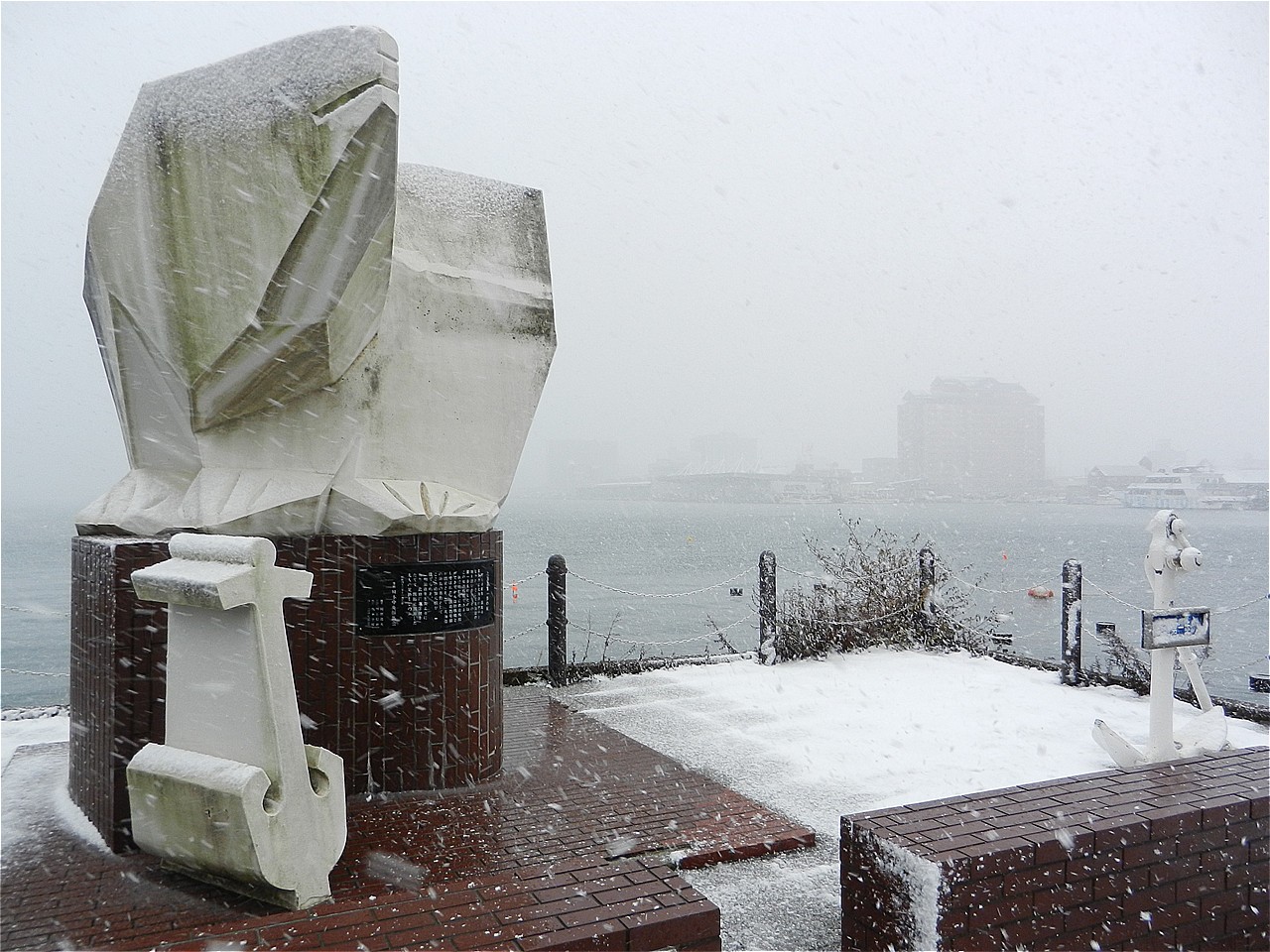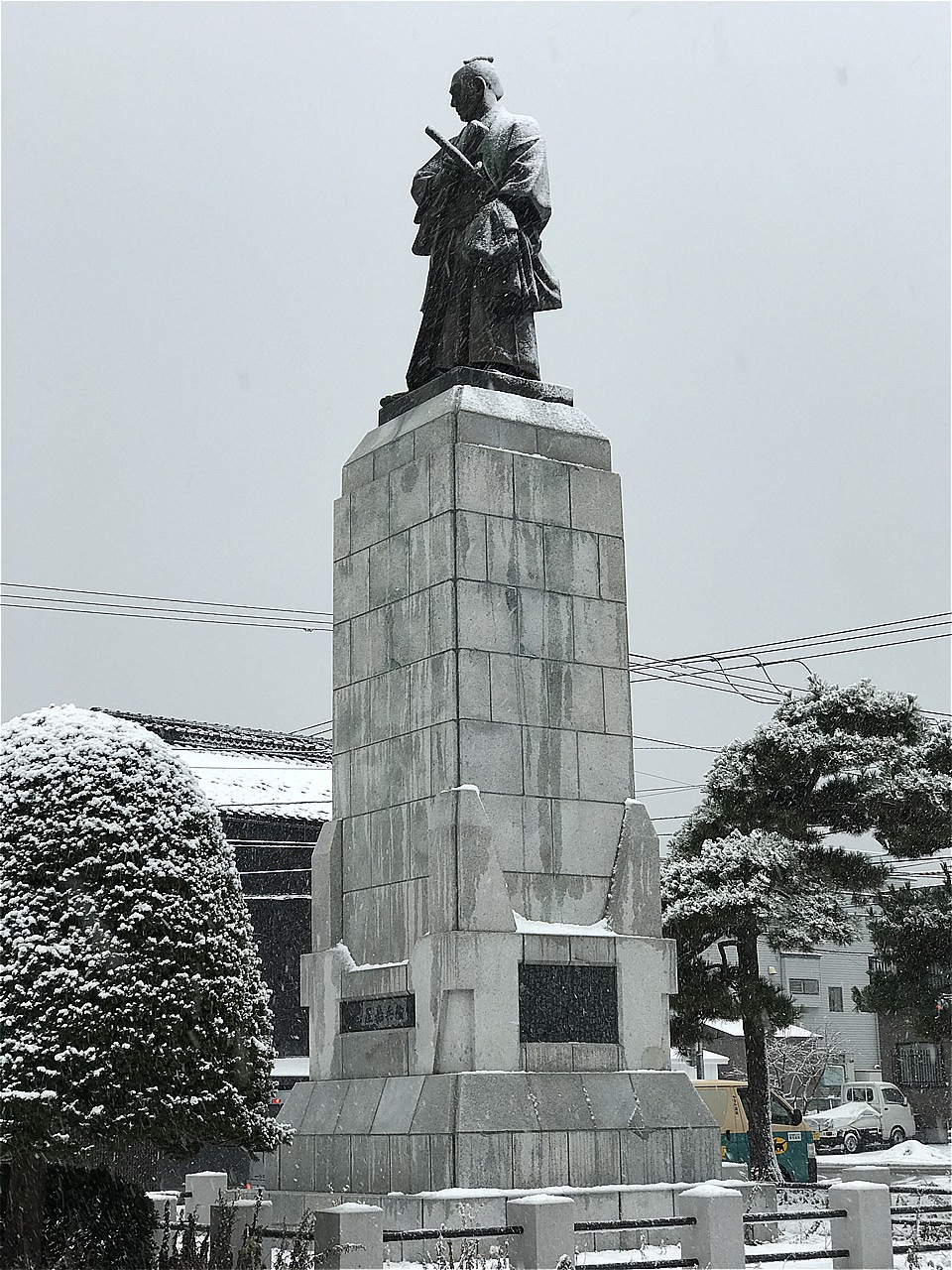 雪が激しくなる前に少しは観光しようと・・・。高田屋嘉兵衛の像。