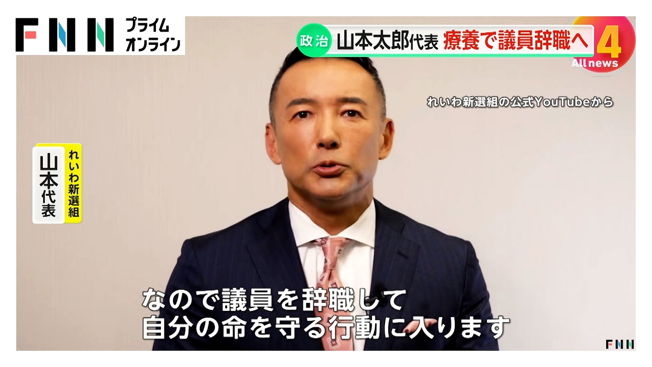 れいわ新選組の山本太郎代表は21日、参院に辞職願を提出し、許可された。これに先立ち、党公式のユーチューブチャンネルに動画を投稿し、健康上の問題を理由に辞職すると明らかにした。山本氏は「多発性骨髄腫、血液のがんの一歩手前にいる。進行させないことを最大のテーマに生きなければ、命を失いかねない。無期限の活動休止に入る」と表明。代表職は続投し「業務量を大幅に減らして対応する」と説明した。山本氏は「国会活動は身体的、精神的にかなりのプレッシャーがかかる作業の連続だった」と振り返り「過度なストレスが最も大きな原因だろうなと感じている」と語った。https://news.yahoo.co.jp/articles/2af87a6e851e8951bfc620942ad0fffa956a1244