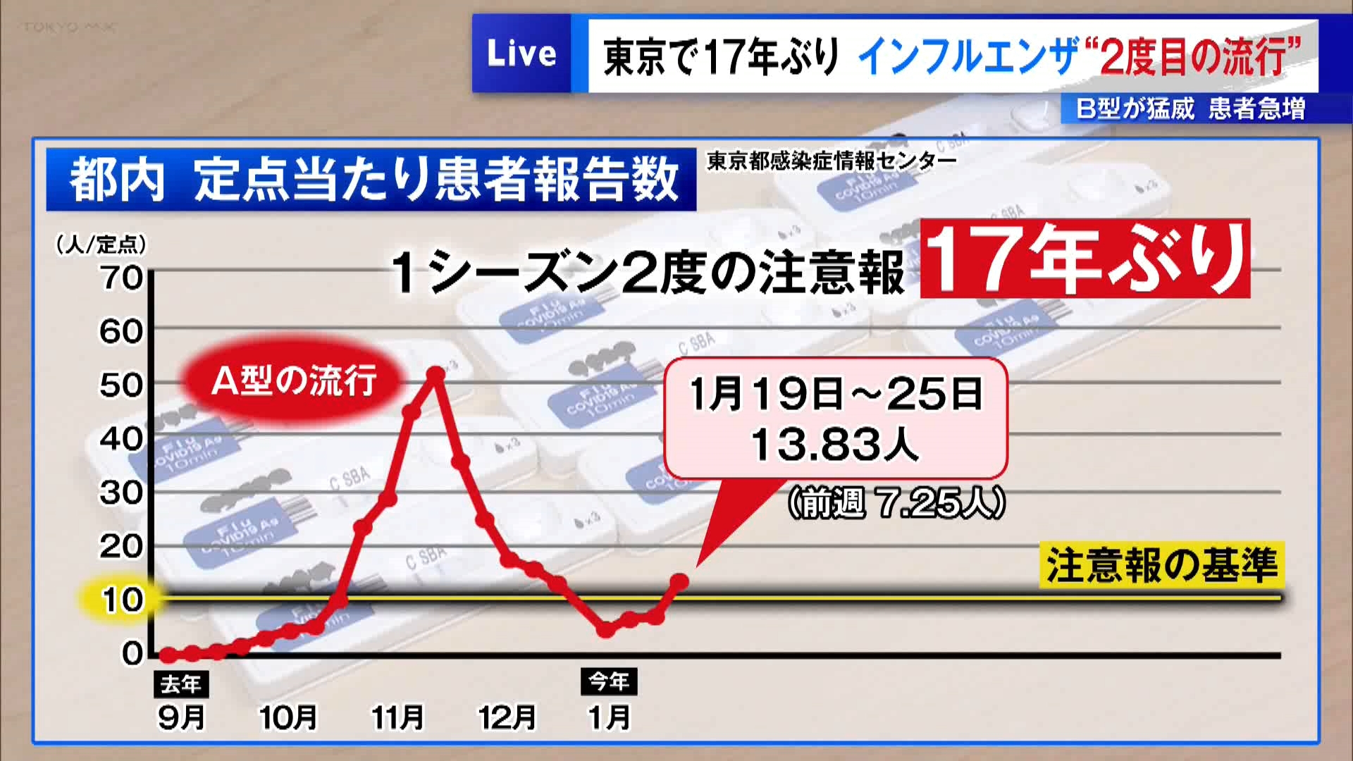 東京都内でインフルエンザが今シーズン2度目の流行という猛威を振るっています。現在は「インフルエンザB型」の患者が増加していて、東京で流行注意報が1シーズンに2度も出るのは17年ぶりです。東京都のインフルエンザ患者数はA型が流行した去年2025年11月にピークを迎え、その後減少しましたが2026年1月ごろから再び増加傾向となっています。1月19日~25日の1週間では、前週と比べて患者の数が倍増し、東京都の注意報基準「10人」を再び超えました。https://news.yahoo.co.jp/articles/c46376f3df14076a24448b12de933402a90fcb2f
