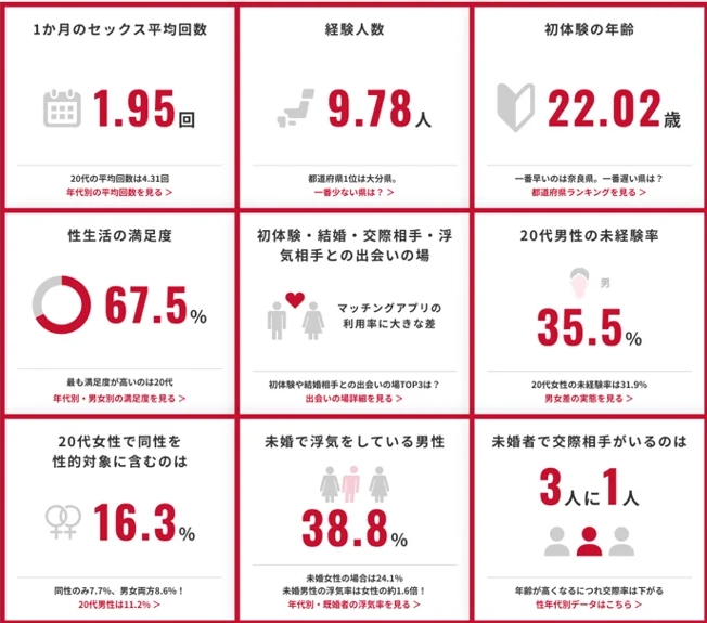 日本初のラテックス製コンドームの製造・販売を手掛けたコンドームメーカー、相模ゴム工業株式会社が日本最大級の性愛調査「ニッポンのセックス2026」の結果を公表した。相模ゴムはコンドームを製造販売するメーカーとして、日本の性に関する調査を定期的に行っていて、7年ぶりの大規模調査とのこと。調査結果の中で目を引くのは「20代男性35.5%、20代女性の31.9%は、性行為未経験」という結果だ。乱暴に言えば20代の童貞・処女率は30%超ということになる。また「都道府県ランキング」も発表。性行為の経験人数が最も多い都道府県は大分県、性行為の経験人数が最も少ない都道府県は岡山県となっていた。https://www.kk-bestsellers.com/articles/-/4208821/