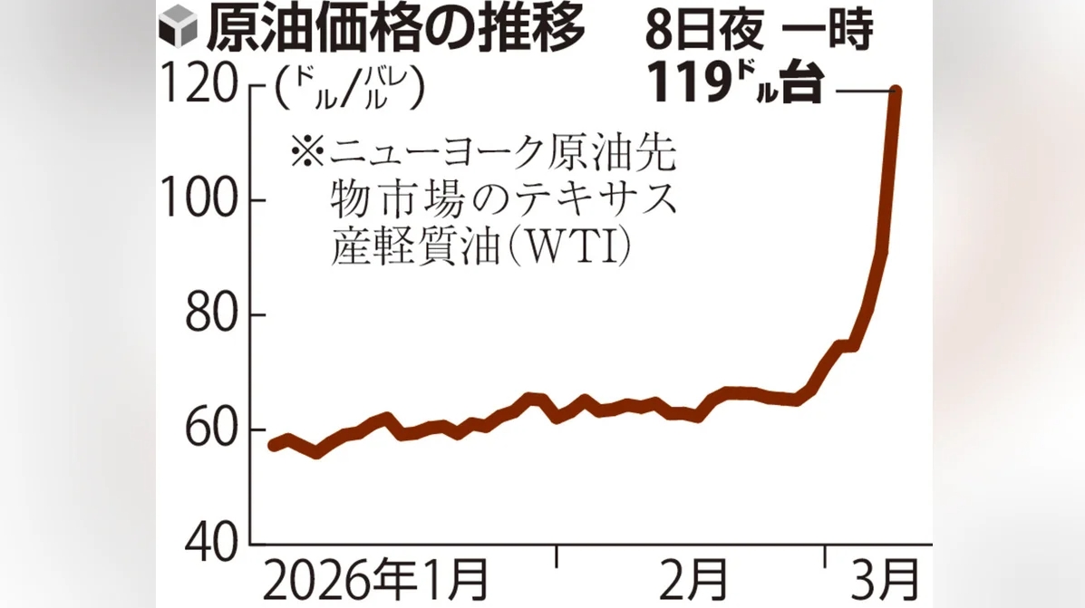米ニューヨーク・マーカンタイル取引所(NYMEX)で日本時間9日午前、国際原油指標のWTI(ウエスト・テキサス・インターミディエート)先物価格が一時1バレル110ドルを超え、3年9カ月ぶりの高値を付けた。イランの最高指導者ハメネイ師の後継に、反米保守強硬派として知られるモジタバ・ハメネイ師が選出されたと伝わった。https://www.nikkei.com/article/DGXZQOUB0908Z0Z00C26A3000000/