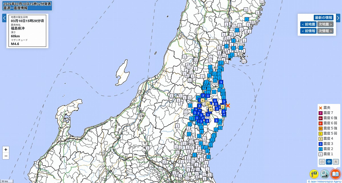 午後3時28分ごろに福島県中通り、浜通りで震度4の地震がありました。震源地は福島県沖で、地震の規模(マグニチュード)は4.6と推定されます。この地震による津波の心配はありません。https://topics.smt.docomo.ne.jp/article/tvasahinews/nation/tvasahinews-000490649