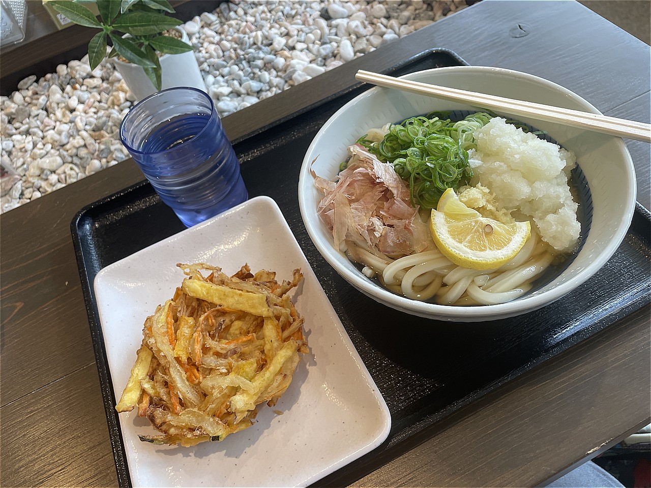 早速うどん店に入って、ぶっかけうどん中盛り冷たいのトッピングにかき揚げ天